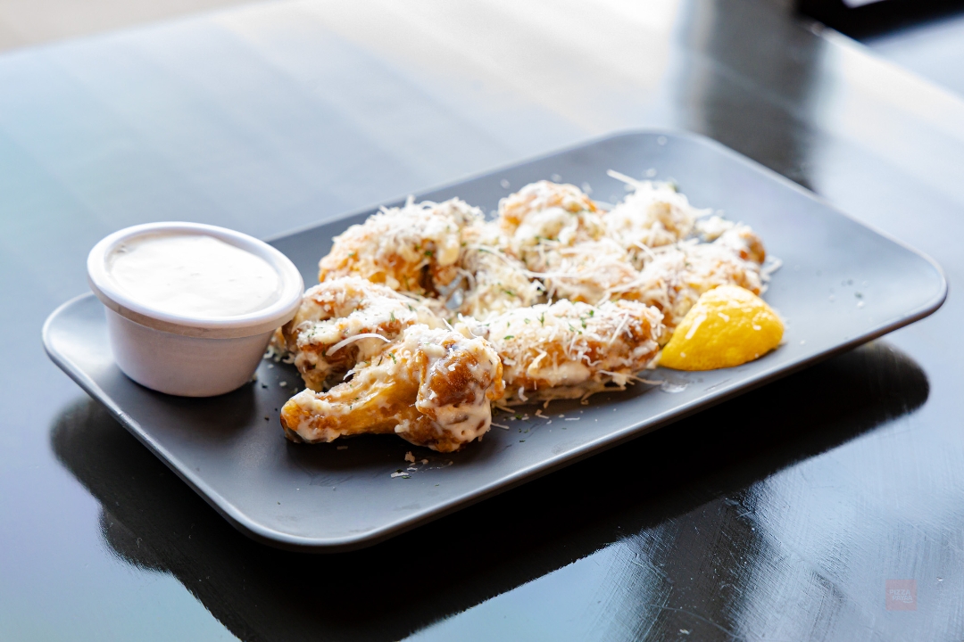 16 of our double fried crispy chicken wings served with your choice of dipping sauce. Gluten Free (Pictured: Garlic Parmesan)